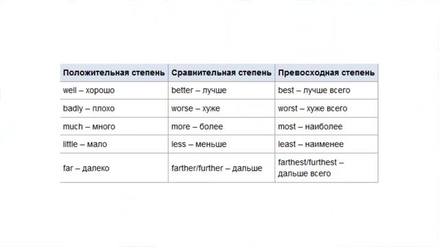 Наречия, так же, как и английские прилагательные, могут образовывать степени сравнения при помощи добавления суффиксов -er и -est. Для многосложных наречий и тех наречий, которые были образованы при помощи суффикса -ly, степени сравнения образуются при помощи слов more и most Исключениями из этого правила являются наречия early и loudly, степени сравнения которых образуются при помощи суффиксов: early – earlier – earliest loudly – louder – loudest Также к исключениям можно отнести наречия quickly и slowly, степени сравнения которых могут образовываться обоими способами: quickly – quicker, more quickly – quickest, most quickly slowly – slower, more slowly – slowest, most slowly Кроме этого, некоторые наречия имеют свои уникальные способы образования степеней сравнения: well – better – best badly – worse – worst much – more – most little – less – least far – farther, further – farthest, furthest Впрочем, многие английские наречия, например, наречия времени (sometimes, when), места (here, somewhere) и некоторые наречия образа действия (thus, somehow, optimally) не имеют степеней сравнения.