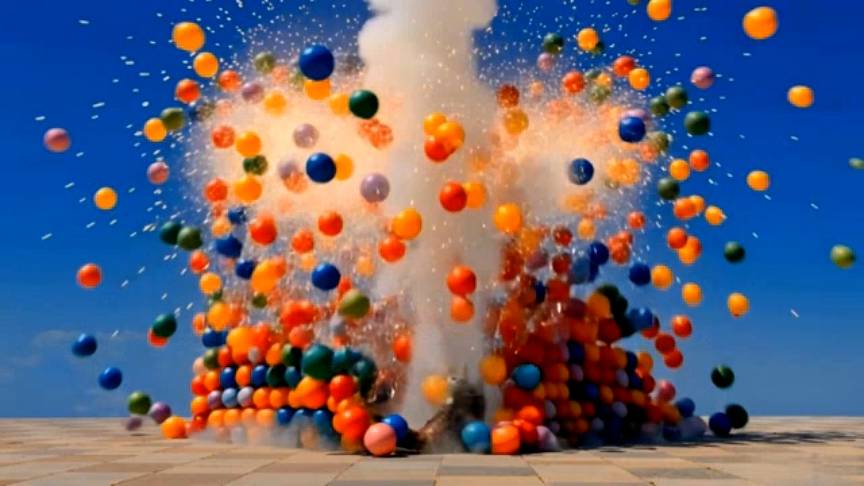 Яркая скульптура куба из разноцветных шаров восхищает своим узором под ясным голубым небом. Внезапно шары быстро разлетаются, и на их месте в кожаном высоком ботинке сидит котёнок #ожившаяфигура #артинсталляция #волшебство #видеоэффект