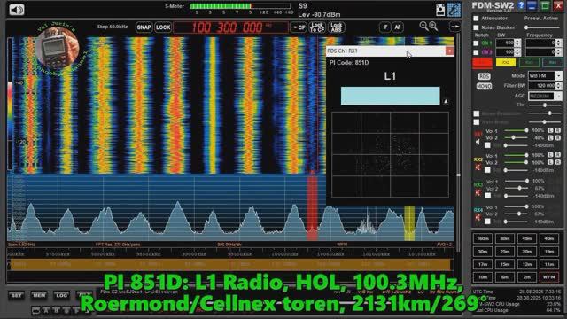 Дальний приём в диапазоне FM. Спорадическое прохождение. Непосредственный приём. L1 Radio, Нидерланды, 100.3МГц, 2131км Принято в Москве: KO85SW. Оборудование: ELAD FDM S2 + полуволновой диполь.