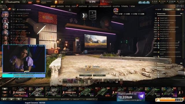 Донат https://www.donationalerts.com/r/crazylfoxy Отправить мем на стрим https://memealerts.com/crazyfoxy Спонсорство на Бусти(фото,видео и др) https://boosty.to/crazylfoxy Альтернативный донат https://donatepay.ru/don/305522 Сбер 5469 5500 1768 3134 ❕Социальные сети: ▶VkPlay Live https://vkplay.live/crazylfoxy ▶Тик-ток https://www.tiktok.com/@crazyllfoxy?lang=ru-RU ▶Трово https://trovo.live/CrazyFoxy ▶Группа vk https://vk.com/crazylfoxy ▶Дискорд сервер https://discord.gg/Tj8EK8W ▶Телеграм-канал + чат https://t.me/crazy_secrets ======================================================= Обо мне Зовут Настя, живу в Питере. Играю не вау, но чуть выше среднего(53%), имеется об.260 и об.279(р), люблю ст, лт и пт. Заказать танк(кроме арты)-200 руб, арта - 300 руб. Взвод - 500 руб/бой. ======================================================= ❗ПРАВИЛА ЧАТА❗ В чате ведем себя адекватно: - нет советам(как играть, как жить и тд) - нет мату - нет КАПСу(большие буквы) - нет рекламе и самопиару - нет спаму - нет политике - религию и ориентацию не обсуждаем ======================================================= Мои озвучки ▶Для Tanks Blitz https://www.youtube.com/watch?v=uOIQRmELMGc ▶Для Мир Танков https://www.youtube.com/watch?v=_rrxlvBk_JU ▶Сайт Протанки(раздел озвучки) https://protanki.tv/mods/ozvuchka-ekipazha-ot-crazy-foxy-dlia-world-of-tank ✨Команды для Бота: !привет, !пк, !дискорд, !лайк, !бомбит, !стата, !совет,!чат, !рак, !твич, !фокси, !озвучка, !хэр, !onlytanks #МИРТАНКОВ #СrazyFoxy #МТ ⚡Ранговые бои на 9 уровнях - МИР ТАНКОВ⚡ Support the stream: https://streamlabs.com/crazyfoxy