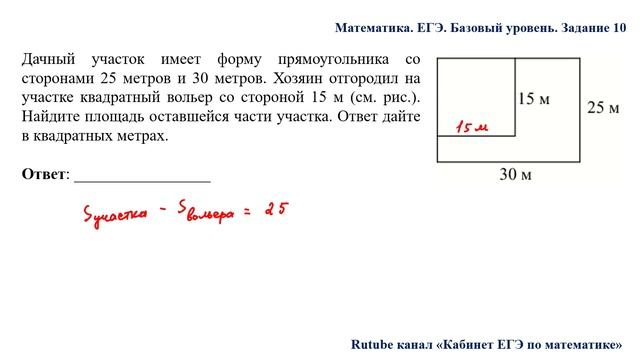 Задание 10. Дачный участок имеет форму прямоугольника со сторонами 25 метров и 30 метров. Хозяин отгородил на участке квадратный вольер со стороной 15 м (см. рис.). Найдите площадь оставшейся части участка. Ответ дайте в квадратных метрах. Курсы для подготовки к ЕГЭ по математике: https://stepik.org/users/608571559/teach Группа ВК: https://vk.com/egeroombaza