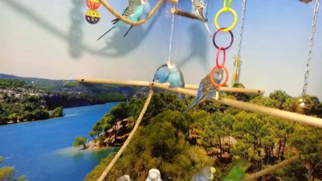 Волнистики в новом вольере о чём-то своём...