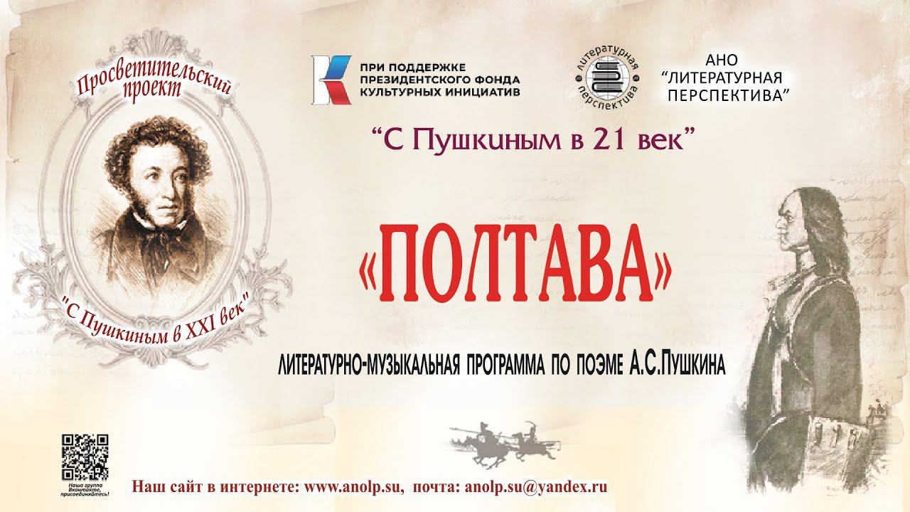 В Крыму прошли культурно-образовательные программы в рамках проекта «С Пушкиным в XXI век». Они посвящены творчеству русского классика и его влиянию на современность. В вечере принимает участие народный артист России Дмитрий Певцов. В связи с последними событиями особое значение приобретает поэма «Полтава». Спустя без малого два века она звучит почти пророчески. На сцене – номера из оперы Петра Чайковского «Мазепа» в исполнении заслуженной артистки Башкортостана, солистки театра «Новая опера имени Евгения Колобова» Елены Терентьевой и приглашённого солиста Большого театра Николая Ефремова. Необычайно живо звучит и музыкальное сопровождение декламаций пианисткой, заслуженной артисткой РФ Полиной Федотовой и скрипачом Давидом Ардуханяном. Не говоря уже о самом пушкинском тексте в исполнении народного артиста РФ Валентина Клементьева и заслуженной артистки России Татьяны Шалковской. Впечатляет зрителя и удивительный видеоряд, который почти два часа иллюстрирует действо своеобразным калейдоскопом историй. Многочисленные портреты Пушкина, издания «Полтавы», иллюстрации к поэме и кадры из фильма Александра Ханжонкова «Мазепа» удалось дополнить редкими портретами коварного и властолюбивого гетмана, а также фотографиями мест, связанных с героями бессмертного произведения. И можно только удивляться невероятным перекличкам прошлого с нашим временем! Ведущая — Алла Панкова. Режиссер видеопоказа — Ирина Панкова Проект "С Пушкиным в 21 век" при поддержке "Президентского фонда культурных инициатив"