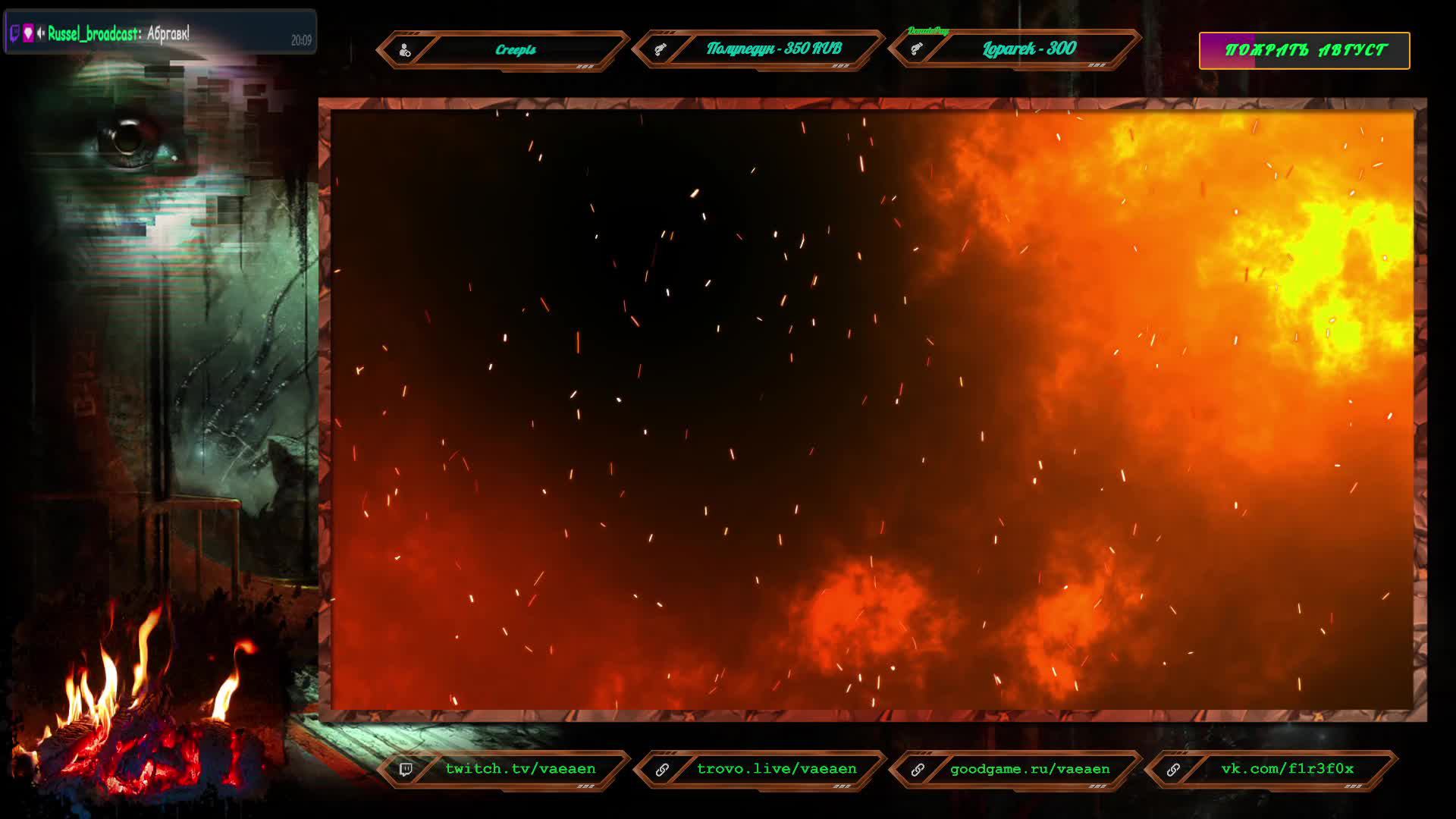 Если хотите поддержать меня как стримера - нажмите по данной ссылке https://www.donationalerts.com/r/f1r3f0x Donate for USD, EU all world - https://new.donatepay.ru/@vaeaen Во время стрима ваше сообщение появится на экране, и будет сопровождаться голосовым диктором. Поддержка на прямую: Сбер: 2202 2010 0629 1039 Тинькофф: 2200 7008 4677 0625 Основные каналы: Twitch: https://www.twitch.tv/vaeaen GoodGame: https://goodgame.ru/channel/Vaeaen/ Trovo: https://trovo.live/Vaeaen Дополнительные: Boosty: https://boosty.to/vaeaen VKplay: https://vkplay.live/vaeaen Wasd: https://nuum.ru/channel/vaeaen YouTube: https://www.youtube.com/channel/UCsl3CyRcImUYtWiCgEdvmjQ