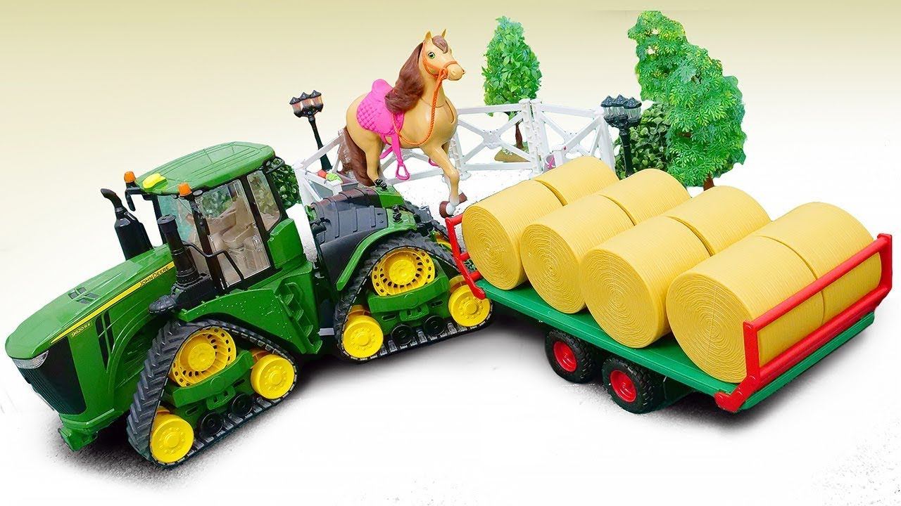Машинки-помощники Брудер: трактор везет сено лошадке. Видео для детей и игрушки