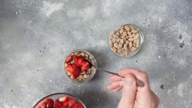 Очень быстрый, простой по ингредиентам и легкий в приготовлении десерт, который при этом очень эффектно выглядит и содержит много белка и клетчатки. Такой десерт можно приготовить на несколько минут на завтрак или полдник. Вместо клубники можно использовать и другие сезонные ягоды или фрукты – например, малину, нарезанные персики или абрикосы.