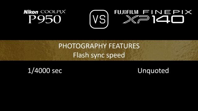 This video overviews the Nikon COOLPIX P950 and the Fujifilm FINEPIX XP140 in a parallel comparison of specifications. Thanks for watching. If you liked this video and found it informative, make sure to subscribe for more. 00:24 LAUNCH 00:32 BODY 00:41 SENSOR 01:05 IMAGE 01:21 OPTICS & FOCUS 02:06 SCREEN 02:26 VIEWFINDER 02:42 PHOTOGRAPHY FEATURES 03:43 VIDEOGRAPHY FEATURES 03:59 STORAGE 04:04 CONNECTIVITY 04:32 PHYSICAL 04:52 MISC