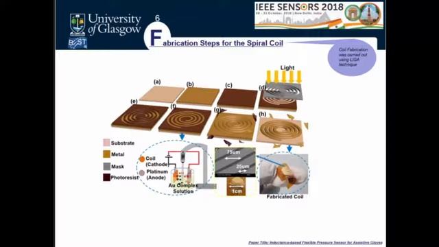 Authors: Oliver Ozioko, Marion Hersh, Ravinder Dahiya Abstract: This paper presents an inductance-based flexible pressure sensor to support the tactile communication between deafblind people. The pressure sensor was realized with a soft ferromagnetic elastomer and a 17µm-thick coil fabricated on a 50 µm thick flexible polyimide sheet. The ferromagnetic elastomer acts as the core of the coil, which when pressed, sees the metal particles moving closer to each other and leads to changes in the inductance. The coil, with 75µm wide wires and 25µm pitch, was realized using LIGA (Lithographie Galvanoformung, Abformung) micro molding technique. Four different sensors have been fabricated using different ratios (1:1, 2:1, 3:1 and 5:1) of ecoflex and iron nanoparticles. The results show that the higher the ratio the better the response of the sensor. The presented sensor is intended to be integrated in a smart glove having dual function of tactile sensing and vibrotactile feedback.