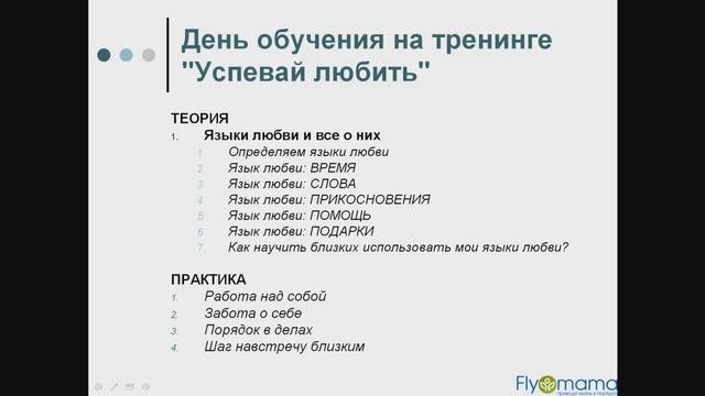 http://timeforlove.info/wppage/trening Главная задача тренинга: научить успевать любить и строить отношения в семье, исходя из умения правильно организовать себя и жизнь семьи. Тренинг состоит из 14 семинаров: 7 теоретических семинаров, посвященным тому, как именно передавать любовь и уметь делать это регулярно и практически; 7 практических семинаров, которые помогают создать ресурсы для того, чтобы быть в силах отдавать любовь своим близким людям. На тренинге вы: очень глубоко разберетесь в языках любви ваших близких людей; полностью упорядочите свою жизни и научитесь заботиться о себе и своих ресурсах, чтобы смочь на практике любить вашу семью. http://timeforlove.info/wppage/trening