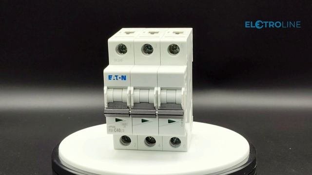 Модульный автоматический выключатель производства Eaton. Номинальный ток 40 А, кривая отключения "С". Состоит из 3 полюсов, с отключающей способностью 6 кА. Крепление на Дин-рейку. Узнать подробнее вы можете на странице товара в нашем интернет магазине по ссылке: https://electroline.ru/product/pl6-c403-avtomaticheskiy-vyklyuchatel-40a-krivaya-otklyucheniya-s-3-polyusa-otkl-sposobnost-6-ka.html