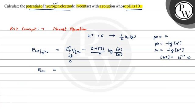 Calculate the potential of hydrogen electrode in contact with a solution whose \( \mathrm{pH} \) is 10 . \( P \) W. 📲PW App Link - https://bit.ly/YTAI_PWAP 🌐PW Website - https://www.pw.live