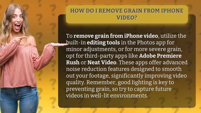 Smooth Your iPhone Videos: Remove Grain Like a Pro • Remove Grain Like a Pro • Learn how to remove grain from iPhone videos using the built-in editing tools in the Photos app or advanced noise reduction features in third-party apps like Adobe Premiere Rush or Neat Video. Improve your video quality by capturing footage in well-lit environments.