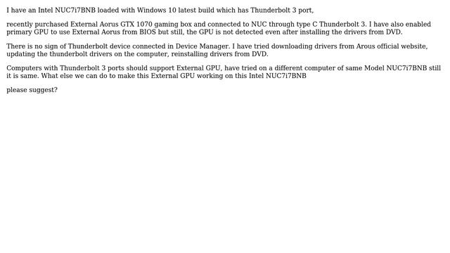Intel NUC7i7BNB with External Aorus GTX 1070 Helpful? Please support me on Patreon: https://www.patreon.com/roelvandepaar With thanks & praise to God, and with thanks to the many people who have made this project possible! | Content (except music & images) licensed under CC BY-SA https://meta.stackexchange.com/help/licensing | Music: https://www.bensound.com/licensing | Images: https://stocksnap.io/license & others | With thanks to user Ranveer (superuser.com/users/580253), user Ben Voigt (superuser.com/users/29943), and the Stack Exchange Network (superuser.com/questions/1394953). Trademarks are property of their respective owners. Disclaimer: All information is provided "AS IS" without warranty of any kind. You are responsible for your own actions. Please contact me if anything is amiss at Roel D.OT VandePaar A.T gmail.com