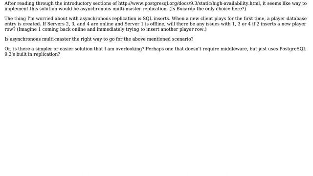 Databases: Which Postgresql Replication Solution to Use? (Asynchronous Multimaster / Bucardo?) Helpful? Please support me on Patreon: https://www.patreon.com/roelvandepaar With thanks & praise to God, and with thanks to the many people who have made this project possible! | Content (except music & images) licensed under CC BY-SA https://meta.stackexchange.com/help/licensing | Music: https://www.bensound.com/licensing | Images: https://stocksnap.io/license & others | With thanks to user Richard (dba.stackexchange.com/users/55797), user Nathanael Weiss (dba.stackexchange.com/users/23098), user Craig Ringer (dba.stackexchange.com/users/7788), and the Stack Exchange Network (dba.stackexchange.com/questions/49554). Trademarks are property of their respective owners. Disclaimer: All information is provided "AS IS" without warranty of any kind. You are responsible for your own actions. Please contact me if anything is amiss at Roel D.OT VandePaar A.T gmail.com