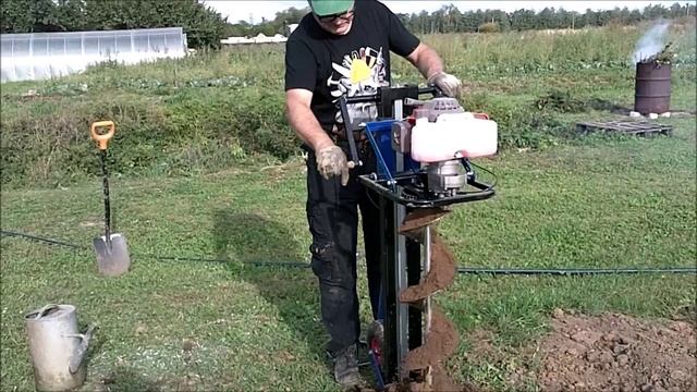 процесс бурения скважины в земле на глубину 1 метр при помощи шнека, бензобура и стойки для ручного бензобура.