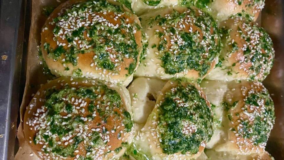 Пампушки с чесноком и зеленью к борщу Молоко-300гр Дрожжи сухие-1,5 ч.л Сахар-6 ст.л Соль-1,5 ч.л Масло сливочное-4 ст.л Масло растительное-100гр Яйцо-2шт Мука пшеничная-500 гр Чеснок-30гр Зелень-70гр Перец черный молотый-1гр Соль-2гр Кунжут-30гр