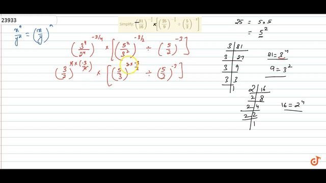 This is the Solution of Question From RD SHARMA book of CLASS 9 CHAPTER NUMBER SYSTEM This Question is also available in R S AGGARWAL book of CLASS 9 You can Find Solution of All Question From RD SHARMA and R S AGGARWAL book from class 6-12 on our app DOUBTNUT for Free #rdsharmasolution #NUMBERSYSTEM #rdsharmaclass9 #class9 #cbse #rdsharma #doubtnut ==== QUESTION TEXT ==== Simplify: `((81)/(16))^(-3/4)x[((25)/9)^(-3/2)-:(5/2)^(-3)]` === DOWNLOAD DOUBTNUT TO ASK ANY MATH QUESTION === https://doubtnut.app.link/lJqHpNiOlP ==== SCORE 100% WITH DOUBTNUT ==== Doubtnut App has video solutions of ALL the NCERT questions from Class 6 to 12 (including IIT JEE). You can also ask any Math question and get a video solution for FREE from a library of more than 1 Lakh Math Videos ==== FOLLOW US ON FACEBOOK ==== Doubtnut PAGE: https://www.facebook.com/doubtnut DOUBTNUT IIT JEE Group: https://www.facebook.com/groups/251747588948573 ==== WATCH DAILY LIVE CLASSES ON YOUTUBE ==== 5:30 PM - Class 9 6:30 PM - Class 10 7:15 PM - Class 11 8:15 PM - Class 12 9:15 PM - Class 13 (DROPPERS)