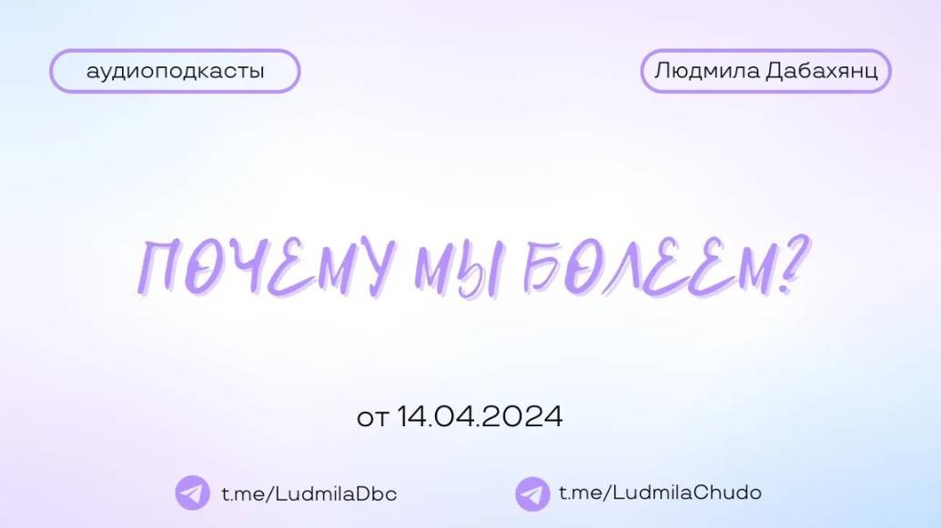 Аудиоподкаст от 14.04.23 На тему «ПОЧЕМУ МЫ БОЛЕЕМ?» ТЫ МОЖЕШЬ ПРИЙТИ СО СВОИМ ЗАПРОСОМ! ✓ Обязательно поставь лайк ✓ Подпишись на канал ✓ И поделись с близкими Это будет вашим балансом за движение и получение энергии. Если есть желание создать баланс брать-давать... приму от всего сердца с благословением (донейшн). С Огромной Любовью, Дабахянц Людмила ✨ Telegram: https://t.me/ludmiladbc ✨ Канал в telegram “Я ЕСТЬ ТО, ЧТО Я ЕСТЬ”: https://t.me/LudmilaChudo ✨Онлайн-школа: https://ludmilachudo.skillspace.ru/school