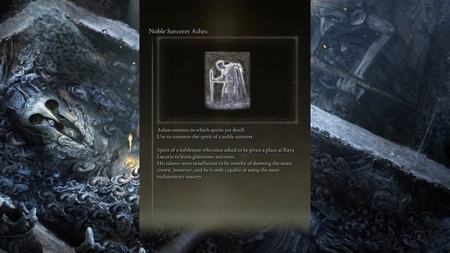 Elden Ring Narrated Compendium NOBLE SORCERER ASHES Ashen remains in which spirits yet dwell. Use to summon the spirit of a noble sorcerer. Spirit of a nobleman who once asked to be given a place at Raya Lucaria to learn glintstone sorceries. His talents were insufficient to be worthy of donning the stone crown, however, and he is only capable of using the most rudimentary sorcery.