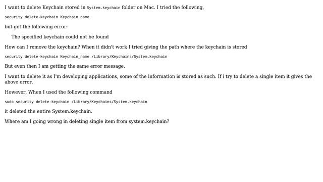 Deleting the system keychain from Mac, specified keychain could not be found Helpful? Please support me on Patreon: https://www.patreon.com/roelvandepaar With thanks & praise to God, and with thanks to the many people who have made this project possible! | Content (except music & images) licensed under cc by-sa 3.0 | Music: https://www.bensound.com/royalty-free-music | Images: https://stocksnap.io/license & others | With thanks to user random (https://superuser.com/users/307), user Daniel Beck (https://superuser.com/users/22317), user chitnisprasanna (https://superuser.com/users/116283), and the Stack Exchange Network (http://superuser.com/questions/382108). Trademarks are property of their respective owners. Disclaimer: All information is provided "AS IS" without warranty of any kind. You are responsible for your own actions. Please contact me if anything is amiss at Roel D.OT VandePaar A.T gmail.com.