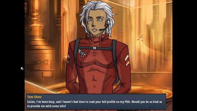 Not all video game companies are large corporations. Plenty of independent game developers exist as well, and their games can be as good as anything from the big companies. Minecraft, the best-selling video game of all time, was invented by indie developer Markus Persson of Sweden. Another indie developer of note is Celso Riva, an Italian developer who produces games under the Winter Wolves label. Several of them have won critical acclaim, and I’ll be tackling one of them in Planet Stronghold. Released by Riva in 2011, it’s a sci-fi role-playing game set on the titular world. Planet Stronghold, like most Winter Wolves games, is a visual novel—it combines text driving the story with fairly static drawings of the characters and their surroundings. Like most RPGs, there are a lot of decisions for the main character to make that affect the course of the story, and it also follows the lead of BioWare games like Dragon Age in allowing relationships with other characters, including romances. When I start a new game, our first decision is to choose whether to be a male or female character. The game has two pre-made characters for us, Joshua Nelson and Lisa Nelson, and whichever one we choose will be our character while the other won’t exist in this playthrough. There’s no difference between the two in terms of gameplay ability, but gender naturally has a big impact on romances—a central part of most Winter Wolves games—as well as some minor plot details. I choose to play as Joshua, and then we have to choose difficulty level. Difficulty level in Planet Stronghold does two things: it affects how many points we receive for character attributes when we level up, and it affects the strength and quality of our opposition in the game’s battle mode. There are five difficulty levels to choose from: Visual Novel mode (which completely removes battle mode and causes us to instantly win every fight), Easy, Medium, Hard, or Nightmare. As always, I want to play the toughest difficulty, so I select Nightmare. After a stern warning from the game about the challenge it poses, we begin the story. As Joshua Nelson, we’re a private fresh out of military training and have been assigned to the garrison at Planet Stronghold. We’re not completely sure why yet—Planet Stronghold is supposed to be a very prestigious assignment—but there are rumors of problems on-world. Regardless, we’re certainly happy to be here. As we start to explore, we’re greeted by a dark-skinned man in a red uniform. This is Tom Shatz, a lieutenant in the Planet Stronghold garrison and the highest-ranking military officer we’ll meet in the course of the game. I make sure to respond politely—the game gives us a polite option and two rather snotty options—and Shatz takes us inside the planetary hangar. He asks us what our “specialty” was at the military academy, and this is another key choice—we now have to choose Joshua’s character class. We could be a Psionic, which is the rough sci-fi equivalent of a mage—Psionics use the power of their minds to heal friendly party members and inflict damage on enemies, but can’t use traditional guns. On the other end of the spectrum, a Soldier is more like a fantasy barbarian. Soldiers have more health than anyone, but have lousy Psionic ability. The other two options, Guardian and Scout, are somewhat mixed. Guardians have less health than Soldiers, but have offensive Psionic abilities and can use heavy weapons while Soldiers are limited to pistols. Scouts are a sniper class and excel at accuracy as well as having some defensive Psionic ability, but they have low health. For this playthrough, I’m going to be a Scout. When I select the option, Tom helpfully fills us in on our choice. Notably, there are several situations outside of combat where we’ll need to pass skill checks to accomplish various things, and different classes are good at different types of noncombat skills. As a Scout, we excel at roughing it in a harsh environment (represented by the Survival skill) and getting past enemy defenses undetected (represented by the Sneak skill). Once I get past the text explaining our class ability, we’re also given some more information about gameplay, including how to access our character pages. I decide to show off both Joshua’s page and Tom’s to demonstrate what each is equipped with as well as their stats. We’re at Level 1 and, as a Scout, we’re equipped with a sniper rifle. Tom is a Guardian character equipped with a submachine gun, and at Level 4 he’s significantly more advanced than us. That’ll change as the game goes on, though.