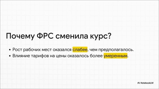 Документ под названием «Еженедельный обзор» обсуждает недавнее решение Федеральной резервной системы снизить целевую ставку по федеральным фондам на 25 базисных пунктов, что сигнализирует о сдвиге в сторону приоритета роста над инфляцией. На это решение повлияли пересмотренные данные, указывающие на более слабый рост занятости и умеренное влияние тарифов. Федеральный комитет по операциям на открытом рынке (FOMC) в основном поддержал сокращение, хотя один из членов не согласился, выступая за большее сокращение. Рынки ожидают дальнейшего снижения ставок в 2026 году, превышающего ожидания FOMC. В отчете также перечислены ключевые экономические события, запланированные на предстоящую неделю, включая доверие потребителей, данные PMI и продажи новых домов. Он включает в себя рыночную статистику, охватывающую акции, спреды облигаций, доходность облигаций, товары, валюты и волатильность. Наконец, он представляет макроэкономические данные по ВВП, ИПЦ и показателям оценки для различных регионов и рынков. #ФедеральнаяРезервнаяСистема #СнижениеСтавки #АнализРынка #ЭкономическийПрогноз #ЕженедельныйОбзор #Финансы #Инвестиции #МировыеРынки документ - https://am.jpmorgan.com/gb/en/asset-management/per/insights/market-insights/market-updates/the-weekly-brief/ подписаться - https://t.me/arxivpaperu отправить донаты: USDT: 0xAA7B976c6A9A7ccC97A3B55B7fb353b6Cc8D1ef7 BTC: bc1q8972egrt38f5ye5klv3yye0996k2jjsz2zthpr ETH: 0xAA7B976c6A9A7ccC97A3B55B7fb353b6Cc8D1ef7 SOL: DXnz1nd6oVm7evDJk25Z2wFSstEH8mcA1dzWDCVjUj9e создано с помощью NotebookLM