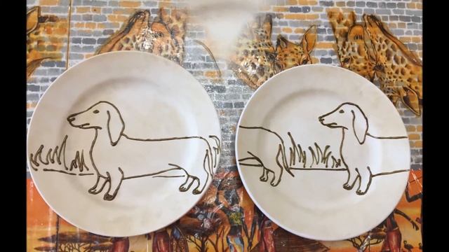Декор тарелки к Новому году 2018 - году Жёлтой Земляной собаки. Обезжириваем тарелки Ацетоном. Покрываем тарелки белой акриловой краской. Пока белый слой не засох наносим с помощью губки золото-металлик. В интернете нашла подходящие рисунки собак, распечатала, вырезала. Обвела картинку карандашом, остальное дорисовала сама. Контуром бронза обвожу рисунок, рисую травку, дорогу. Краской золото-металлик крашу собак. Акриловыми красками крашу небо в два цвета: белый и голубой, а дорогу в чёрный и серый. Краской золото скифов тонирую все выпуклые части от контура. Покрываю акриловым лаком на 2-3 слоя.