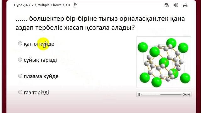 7-сыныпта "Заттың агрегаттық күйі" тақырыбын оқу кезінде қолдануға болады. Бұл тест жасау үшін Wondershare QuizCreator пайдаланылды. Файл форматы:exe Егер сізге бұл тест қажет болса, оны осы сайттан жүктеп алуға болады: https://khimiya.forum2x2.ru/t126-topic#126
