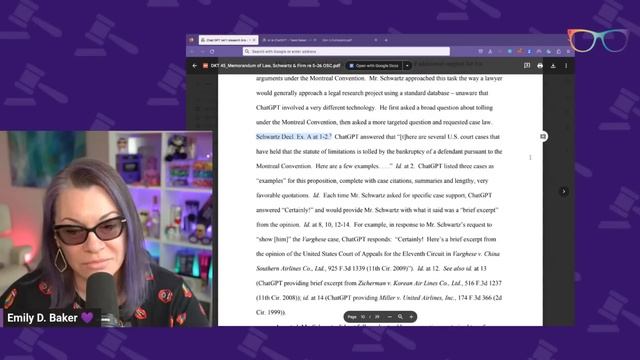 #AI #Lawyer #ChatGPT THE DOCKET 0:00 Welcome 3:00 VPR Chat 20:15 Bad Spaniels 45:42 ChatGPT Gets Sued For Defamation 1:18:39 Lawyers Respond To ChatGPT Sanctions 2:59:27 Schwartz Affidavit 3:28:00 Thomas Corvino Affidavit 3:30:36 Declaration of Alger 3:39:29 Q&A STAY IN THE LOOP WITH EMILY D. BAKER Get the Alert Free: https://www.LawNerdAlert.com WHAT I USE TO STREAM - STREAMYARD: https://streamyard.com/emily Proud Streamyard Partner! Join the community for exclusive content: https://www.LawNerdsUnite.com Business Inquiries: [email protected] Mailing Address: Emily D. Baker 2000 Mallory Ln. St. 130-185, Franklin Tn 37067 WHAT I USE TO STREAM - STREAMYARD: https://streamyard.com/emily LAW NERD MERCH! https://www.LawNerdShop.com Help with the shop: [email protected] LONG-FORM CONTENT https://www.youtube.com/@TheEmilyDBaker The Emily Show Podcast on YouTube: https://emilydbaker.com/TheEmilyShowPlaylist Apple Podcasts: https://emilydbaker.com/AppleTheEmilyShow Spotify Podcasts: https://emilydbaker.com/SpofityTheEmilyShow On your favorite podcast player Wednesdays QUICK CONTENT? Quick Bits Podcast: https://emilydbaker.com/quickbitsplaylist Apple Podcasts: https://emilydbaker.com/AppleQuickBits Spotify Podcasts: https://emilydbaker.com/SpotifyQuickBits Quick Bits Channel : https://www.youtube.com/@EmilyDBakerQuickBits EMILY ON SOCIAL Instagram: https://www.Instagram.com/TheEmilyDBaker Twitter: https://www.Twitter.com/TheEmilyDBaker Facebook: https://www.facebook.com/TheEmilyDBaker MY YOUTUBE ANALYTICS TOOL **My Favorite YOUTUBE TOOL VidIQ https://vidiq.com/LawNerd Shop for the lipgloss I love and support the channel at the same time! Visit our friends at Gerard Cosmetics → https://emilydbaker.com/GC Follow My Cats on Instagram: https://www.instagram.com/fredandgeorge_cat Emily’s glasses lenses are Irlen tint https://www.irlen.com *This video is not legal advice; it is commentary for educational and entertainment purposes. Some links shared are affiliate links, all sponsorships are stated in video. Videos are based on publicly available information unless otherwise stated. Sharing a resource is not an endorsement; it is a resource. Copyright 2020-2023 Baker Media, LLC*