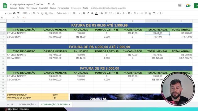 Faala pessoal!! Enfim o vídeo de comparação entre o cartão VISA XP e C6 CARBON!! Muitos alunos e seguidores estavam pedindo essa batalha entre cartões e agora esta pronto! Nesse vídeo, montei um tabela bem prática e objetiva dos benefícios dos cartões e três simulações de fatura para comparar pagando anuidade do C6 Carbon e isentando ela. Desculpem as fungadas, rsrsrs. Ainda estou gripado. ———————————————————————————————————— Descubra o segredo de transformar seus gastos em renda!! Conheça a metodologia que transformou a vida de muitas pessoas!! Somente com seus gastos mensais é possível conquistar um 14º salário ou a sua viagem dos sonhos. ??TREINAMENTO DOMINE AS MILHAS AÉREAS E TENHA RENDA EXTRA?????? https://julianothomas.com.br/domine-as-milhas-aereas-e-tenha-renda-extra/ Esse treinamento fará você sair do descontrole orçamentário para uma organização de sua vida financeira. A intenção é mostrar para você que o fundamental é mudar seu MINDSET para transformar a atual situação em que se encontra em uma perspectiva de crescimento. ?️?TREINAMENTO M7D?????? https://julianothomas.com.br/treinamento-m7d/ ??MENTORIA SOBRE MILHAS AÉREAS?????? https://sun.eduzz.com/1111435 ??E-BOOK GRÁTIS 9 Programas de fidelidade de cartão que você precisa conhecer antes de entrar no mundo das milhas?????????????? https://julianothomas.com.br/ebook-programa-fidelidade-de-cartao/ ??E-BOOK GRÁTIS SUA PRIMEIRA VIAGEM INTERNACIONAL COM SEUS GASTOS MENSAIS???? https://julianothomas.com.br/ebook-sua-primeira-viagem-internacional-com-seus-gastos-mensais/ ———————————————————————————————————— ?✈️SIGA-NOS NAS REDES SOCIAIS?✈️ ?Instagram - @juliano_thomas https://www.instagram.com/juliano_thomas/ ? Facebook - https://www.facebook.com/julianothomasmilhas ⚪ Telegram: https://t.me/+Gzc625QAdnk4NTdh ? Twitter: https://twitter.com/juliano_thomas