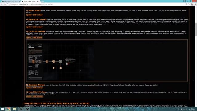 Elite: Dangerous Planet Sounds Project by Akira Masakari A description on how to use the Guide submitted here: https://forums.frontier.co.uk/showthread.php?t=144782 "In the System Map I spot a planet that visually is very similar to an Earth Like, but it is 50,000 LS away. After carefully listening to its sounds it looks like an High Metal, and given the position not evenCandidate for Terraforming. To be sure I Alt-Tab to my thread and listen to a real Earth Like. The sound is different. I don't need to travel 50,000 LS to know the nature of that planet, and leave the system immidiatly with a light hearth.