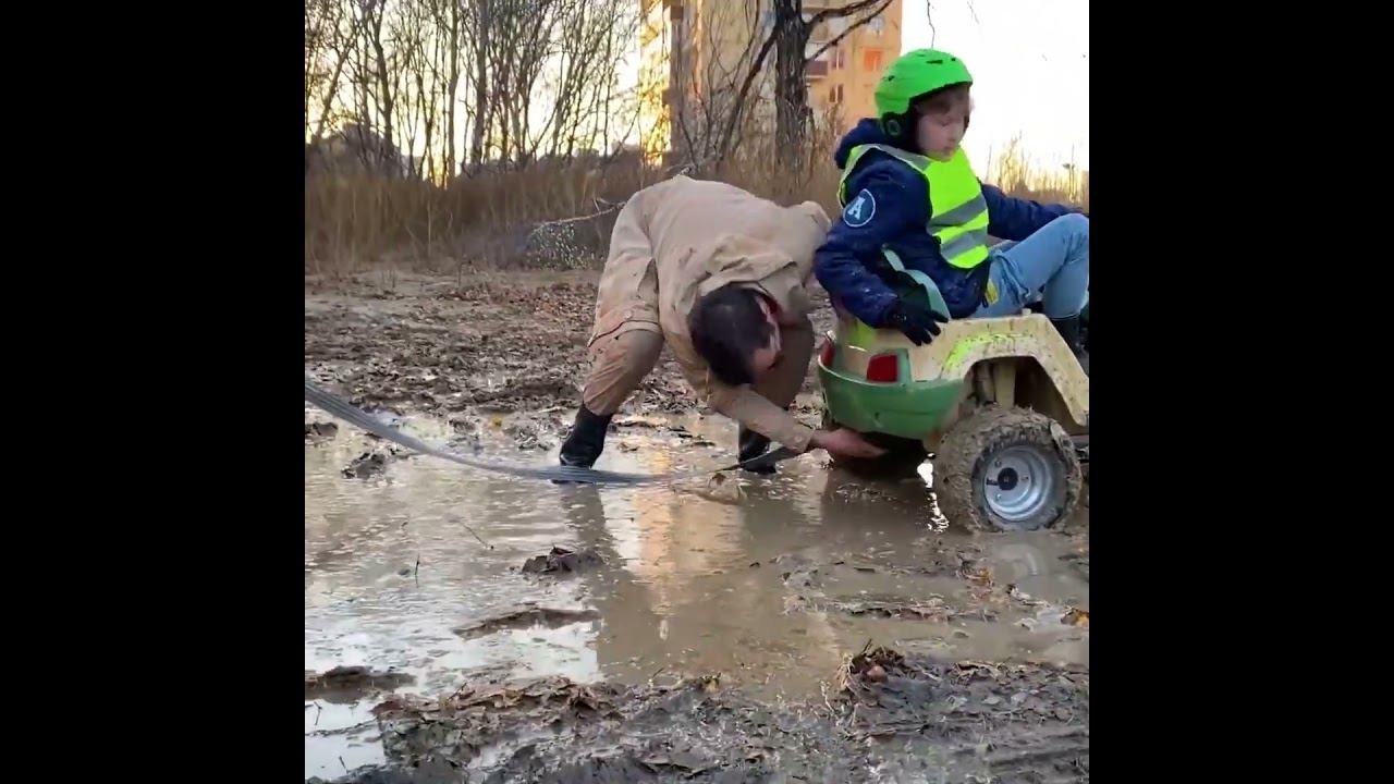 Даня пытается вытащить машину из лужи на буксире. Манкиту