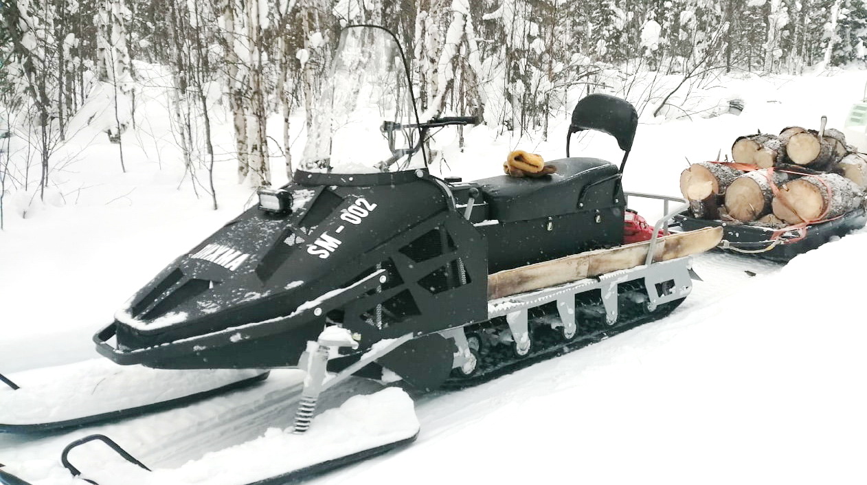 Снегоход СМ-002 и мотособака по северным рекам в снегу.