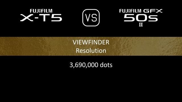 This video overviews the Fujifilm X-T5 and the Fujifilm GFX 50s II in a parallel comparison of specifications. Thanks for watching. If you liked this video and found it informative, make sure to subscribe for more. 00:24 LAUNCH 00:32 BODY 00:40 SENSOR 01:05 IMAGE 01:21 OPTICS & FOCUS 01:45 SCREEN 02:02 VIEWFINDER 02:18 PHOTOGRAPHY FEATURES 03:11 VIDEOGRAPHY FEATURES 03:27 STORAGE 03:31 CONNECTIVITY 03:59 PHYSICAL 04:20 MISC