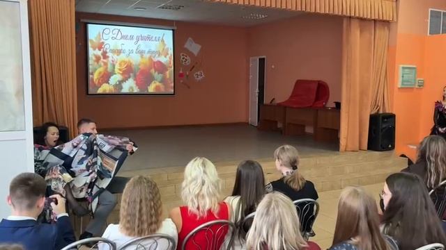 День учителя, школа 114. Танцуют учитель математики, физкультуры и дети.
