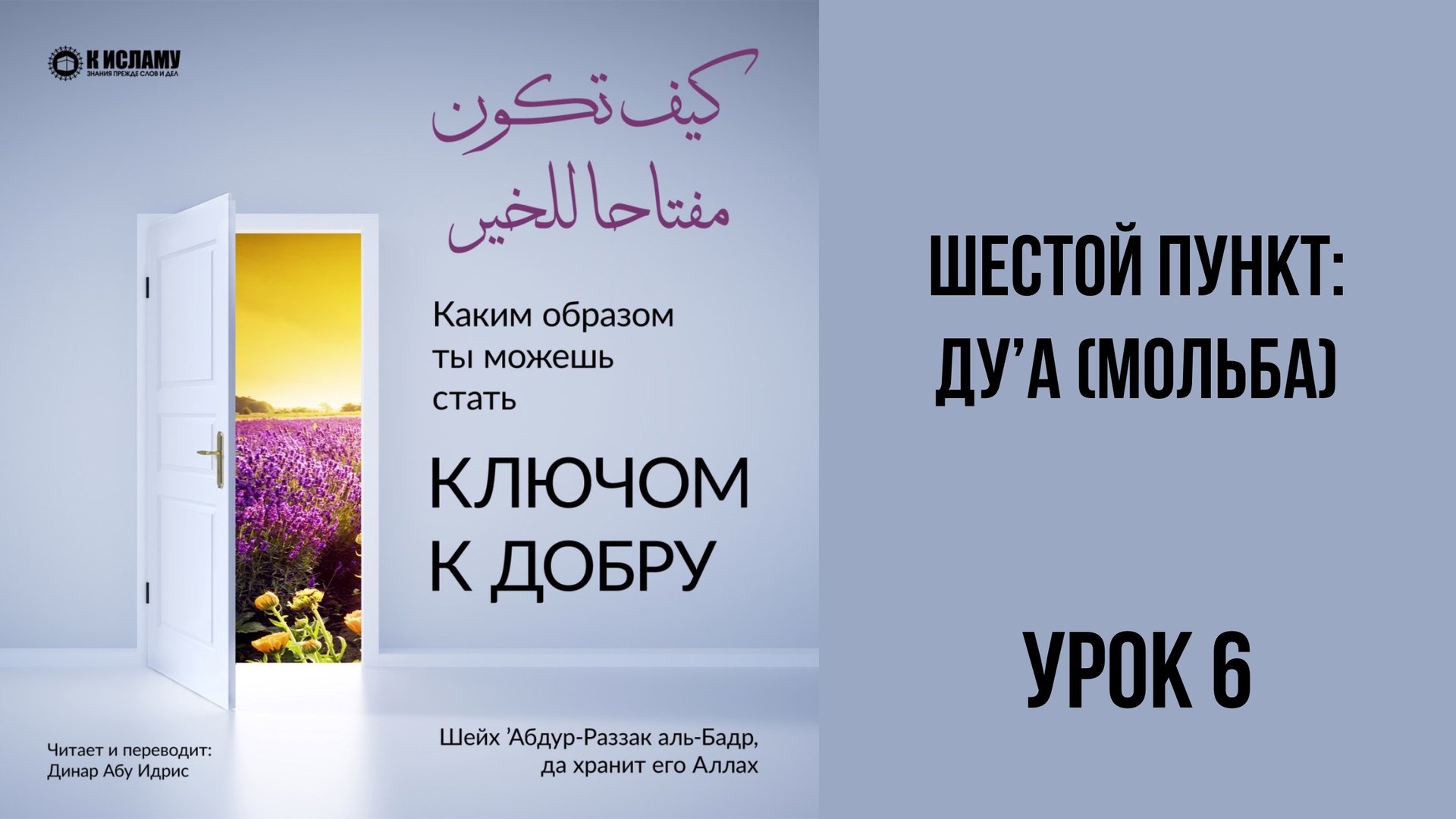 Плейлист в Рутубе: https://rutube.ru/plst/897052 Плейлист в VK Видео: https://vkvideo.ru/playlist/-57367998_10 Плейлист в YouTube:https://www.youtube.com/playlist?list=PLYEMwunvNk-6a26TkINBJO6gKv_D8Hgyz 📘 «Как стать ключом к добру?» ✍ Автор: шейх ’Абдурраззак ибн ’Абдульмухсин аль-Бадр 🎙 Читает и переводит: Абу Идрис Динар да хранит его Аллах 📖 КНИГА в оригинале на Арабском языке: https://static.toislam.ws/files/audio/07_adab/005_vospitanie_dushi/07_kluch_k_dobru/miftah_lil_khair_arab.pdf Подпишись на все уроки Динара Абу Идриса 👇 🗂 https://t.me/addlist/Ck5lQoUzQjlhZGQ6 ✅ Делись ссылкой со своими родными, друзьями! Распространяй благо!