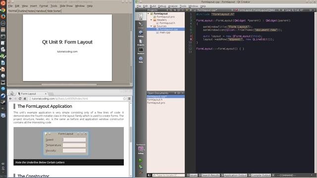 This unit introduces the form layout. The unit site is at: http://tutorialcoding.com/qt/basic/unit009/index.html