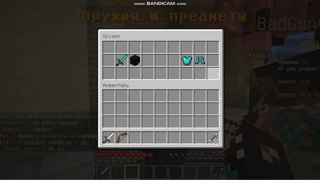 Играю ПвП на сервере! ---------------- Данные сервера: Название сервера: VimeMC.ru ID Сервера : vimemc.ru:25565 ------------------ Версия в которой я играю : 1.12.2 Моды : нет Шейд. : нет Аддоны : нет ------------------ Устройства : ноутбук: MagicBook : Honor мышка : Logitech Pebble M350 Микрофон : не использую (хорошая ВСТРОЕННАЯ запись голоса!) программа для съёма видео с экрана : Bandicam - https://www.bandicam.com/