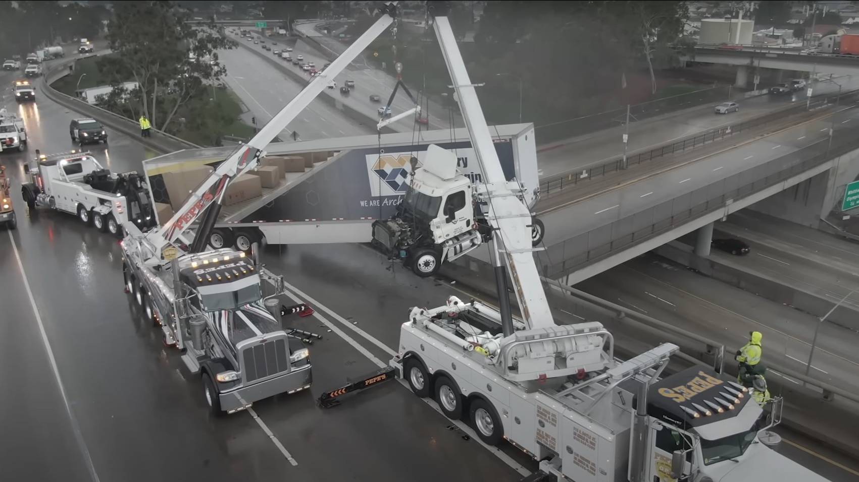 Длинномер Сложился Прямо на Мосту. Заблокировал движение. Спецбригаде пришлось немного попотеть чтобы разобрать трак и убрать с автострады.