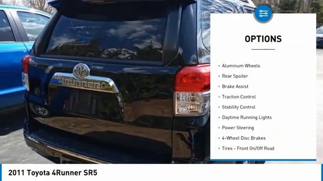 2011 Toyota 4Runner SR5 http://www.toyotaofannarbor.com/ For more information on this vehicle and our full inventory, call us at 734-997-7600 Toyota of Ann Arbor 3745 JACKSON RD ANN ARBOR MI 48103 4WD.CARFAX One-Owner. Clean CARFAX. Odometer is 33421 miles below market average! KBB Fair Market Range High: $20,767 KBB Fair Market Range Low: $17,327 4D Sport UtilityBlack 2011 Toyota 4Runner SR5 4WD 5-Speed Automatic with Overdrive 4.0L V6 SMPI DOHCAwards:* 2011 KBB.com Brand Image AwardsWe're happy to have you stop by anytime or call for an appointment today and EXPERIENCE THE DIFFERENCE in Ann Arbor Michigan.