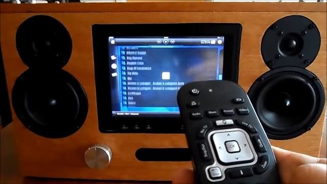 Home made Kitchen Media Center. Made from pressed wallboard and curupixa wood veneer. Hardware: E350M1 motherboard, 16GB SSD, 2 GB ram,TA2024 Class-T Digital Audio Power Amplifier, Speakers, 8" Resistive Touchscreen. Software: ubuntu-mini and xbmc.
