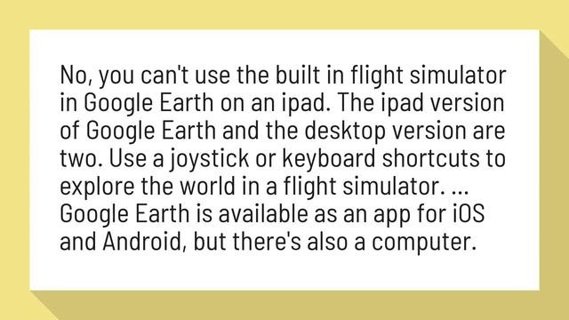 Can Google Earth flight simulator work on IPAD? Google earth flight simulator ipad download Aug 1, 2019 No, you can't use the built in flight simulator in Google Earth on an ipad. The ipad version of Google Earth and the desktop version are two. Use a joystick or keyboard shortcuts to explore the world in a flight simulator. ... Google Earth is available as an app for iOS and Android, but there's also a computer.