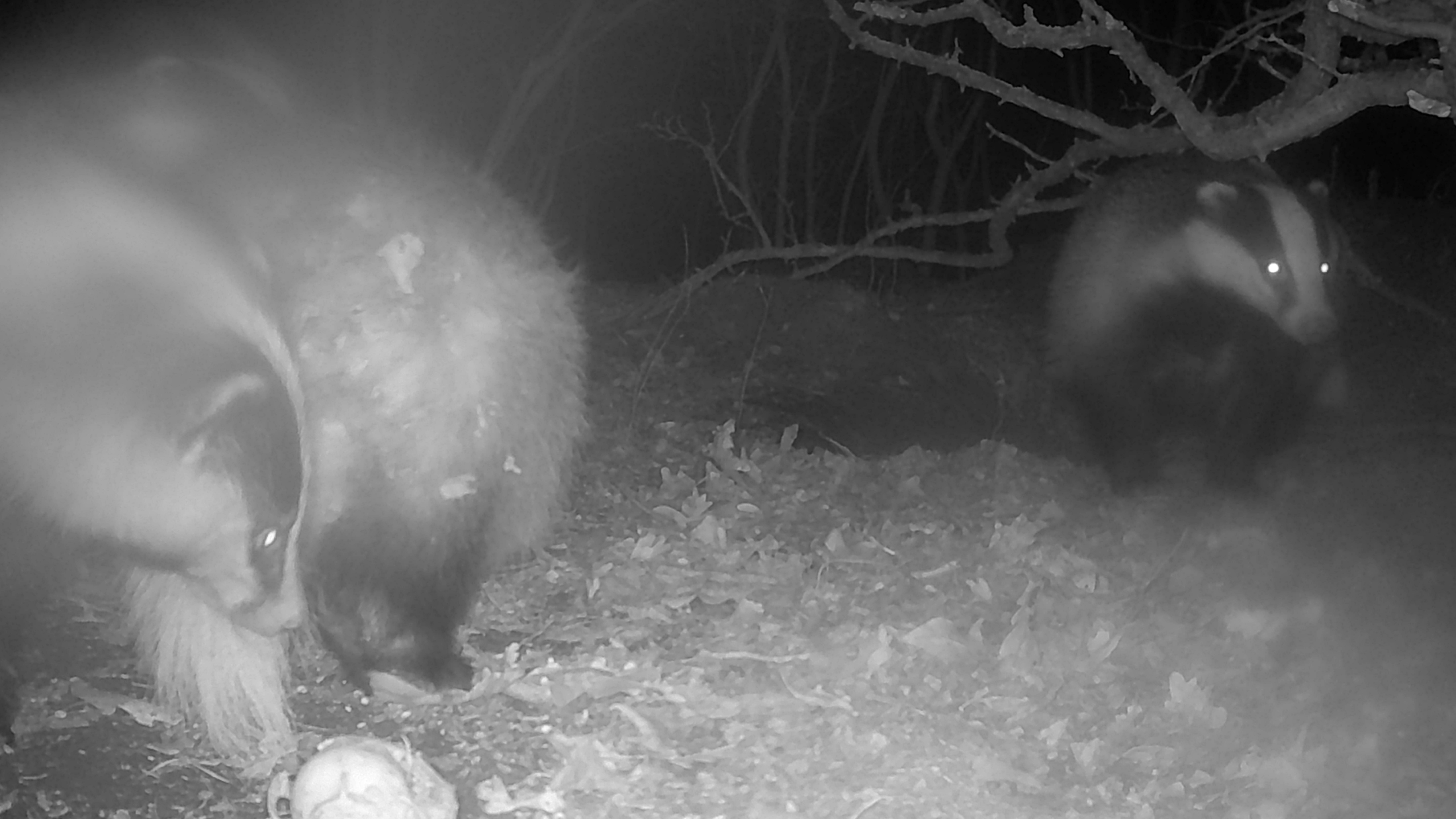 Четверо барсуков изучают фотоловушку. Октябрь 2025