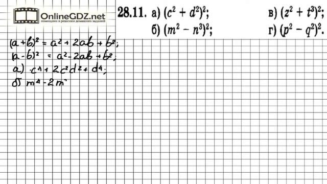 Другие решения смотри тут: https://urokitv.net/46-Reshebnik_GDZ_Algebra_7_klass_Mordkovich_AG/ Urokitv.net это школьные учебники и решебники с 1-го по 11-й класс школы. Ждем ваших предложений и пожеланий. Если вам нравится, то что мы делаем расскажите про нас своим друзьям и одноклассникам. Для преобразования квадрата двучлена воспользуемся формулами квадрата суммы и квадрата разности: (a+b) 2=a 2+2ab+b 2, (a-b) 2=a 2-2ab+b 2. Вашим помощником будет наше видео с решением. Задание № 28.11 - Алгебра 7 класс (Мордкович)