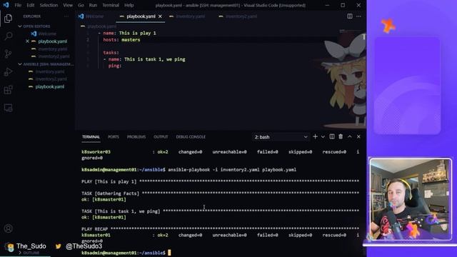 The beginning of a series of videos that dive into using Ansible. This introduction focuses on installing ansible, wiring your first playbook, using an inventory, and variables. Tune in on Twitch Mondays and Wednesdays for more Ansible lessons and other DevOps tools related content: https://www.twitch.tv/the_sudo3 0:00 Intro 2:10 Installing Ansible 8:10 The Ansible Config File 10:20 Create and Distribute Your SSH Keys 16:00 Basic Playbook and Play 20:30 Tasks and Modules 24:20 Gather Facts 27:25 Inventories - INI Format 30:20 Inventories - YAML Format 34:25 Variables - Hosts and Group Variables 47:00 Putting it All Together - Building an NGINX Server 1:00:45 With Items Loop 1:07:40 Ending