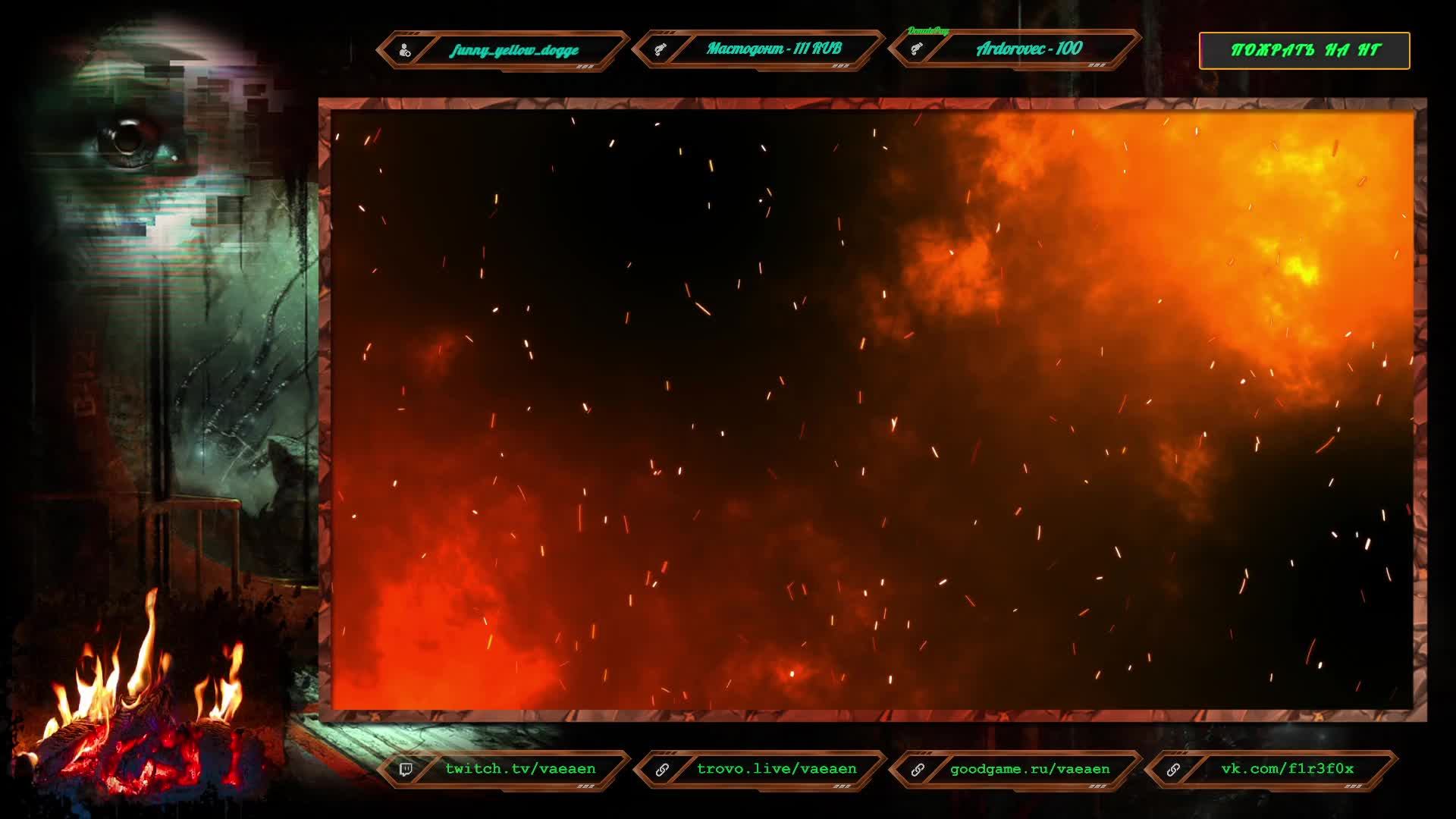 Если хотите поддержать меня как стримера - нажмите по данной ссылке https://www.donationalerts.com/r/f1r3f0x Donate for USD, EU all world - https://new.donatepay.ru/@vaeaen Во время стрима ваше сообщение появится на экране, и будет сопровождаться голосовым диктором. Поддержка на прямую: Сбер: 2202 2010 0629 1039 Тинькофф: 2200 7008 4677 0625 Основные каналы: Twitch: https://www.twitch.tv/vaeaen GoodGame: https://goodgame.ru/channel/Vaeaen/ Trovo: https://trovo.live/Vaeaen