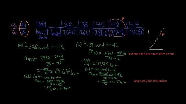A cardiac monitor is used to measure the heart rate of a patient after surgery. It compiles the number of heartbeats after t minutes. When the data in the table are graphed, the slope of the tangent line represents the heart rate in beats per minute. The monitor estimates this value by calculating the slope of a secant line. Use the data to estimate the patient's heart rate. after 42 minutes using the secant line between the points with the given values of t.
