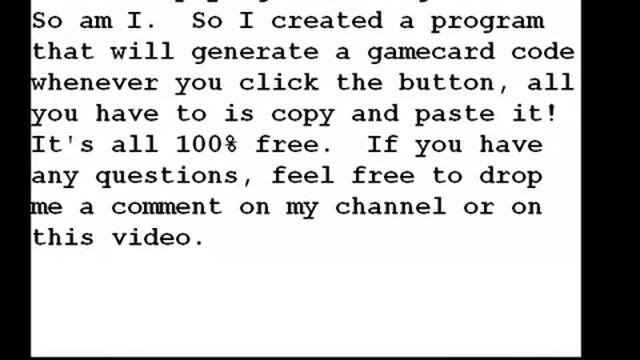 http://goo.gl/xWeYw 10/9/08 UPDATE: NEW PROGRAM! GUARANTEED TO WORK! This program will generate WoW gamecard codes for you to use. You might have to try a few times to get a working one. To Use: 1: Download the program from link above 2: Save it to your desktop, or any other folder 3: Run the program and click generate to make a gamecard code. If you can't get a code using generate, then use random.
