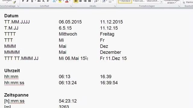 Video erklärt die unterschiedlichen benutzerdefinierten Zahlenformate, die man in Excel, mit der Funktion Text umwandeln kann, damit sie in Serienbriefe effektiv dargestellt werden. Zahl 0 0 6 12 123567 00 00 06 12 123567 0,0 0,1 6,3 12,4 123567,0 0,00 0,12 6,29 12,43 123567,00 0.000,00 0.000,12 0.006,29 0.012,43 123.567,00 #.###,## ,12 6 12 123.567 #.##0,00 0,12 6,29 12,43 132.567,00 Datum TT.MM.JJJJ 06.05.2015 11.12.2015 T.M.JJ 6.5.2015 11.12.2015 TTTT Mittwoch Freitag TTT Mi Fr MMM Mai Dez MMMM Mai Dezember TTT TT.MMM JJ Mi 06.Mai 15 Fr 11.Dez 15 Uhrzeit hh:mm 06:13 16.39 hh:mm:ss 06:13:24 16:39:54 Zeitspanne [h]:mm:ss 54:23:12 [m] 3263 [m]:ss 3263:12 [s] 195792 Prozente 0% 6% 0,00% 6,23% Bruchrechnung 0,5 0,36 4,5 2,12 0/0 1/2 1/3 9/2 17/8 0/00 1/02 9/25 9/02 53/25 ##/## 1/2 9/25 9/2 53/25 # ##/## 1/2 9/25 4 1/2 2 3/25 Wissenschaft 963245678943 0,000000000123466 0,0 E+0 9,6 E+11 1,2 E-10 0,00 E+000 9,6 E+011 1,2 E-010 Bankleitzahlen 000 000 00 642 125 74