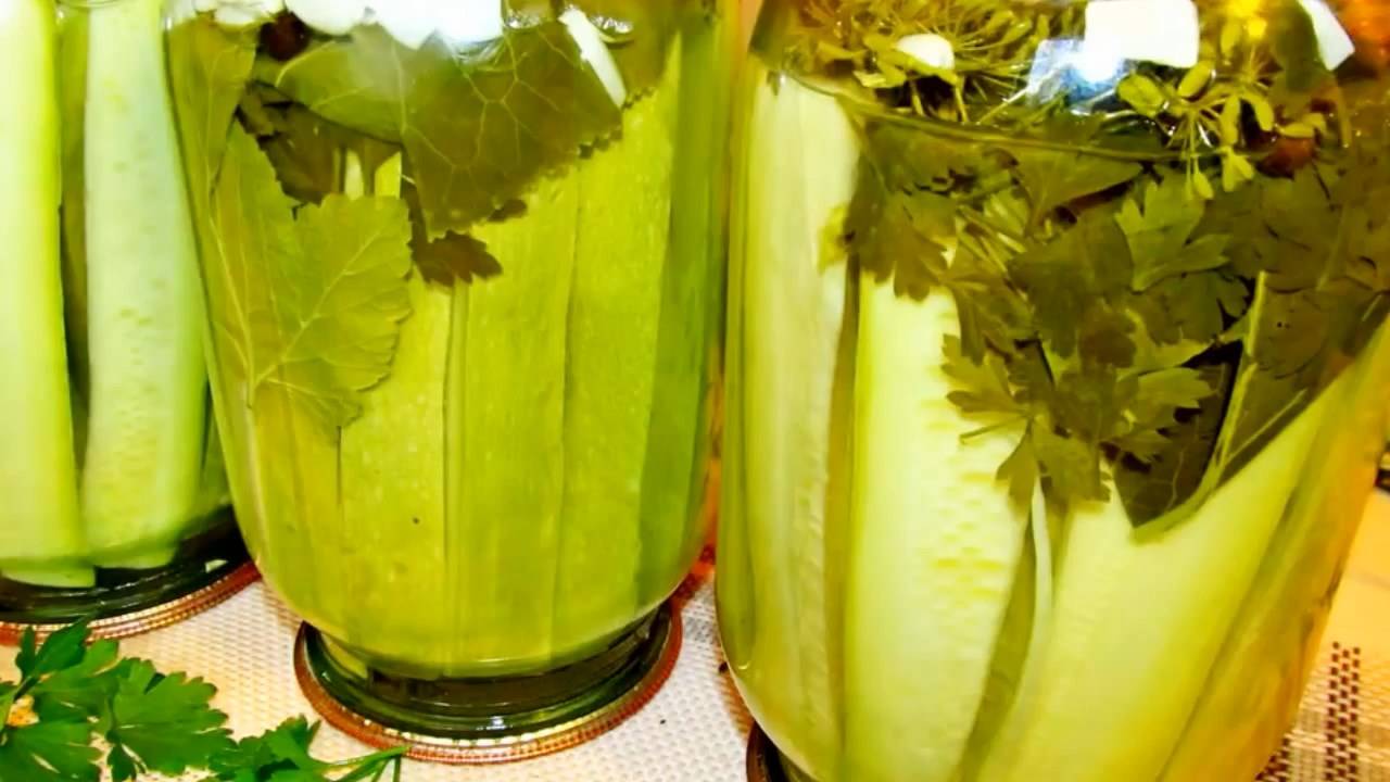 Эта пикантная закуска понравится всем. А ведь их можно приготовить и на свой вкус. Они могут быть сладковатыми, острыми, пряными. На зиму приготовить такие просто нужно! Кабачки - 2, 5 кг ( нежных молодых) Зелень - укроп, петрушка, листья хрена, листья смородины чёрной Лавровый лист - 1 шт в баночку 1литр Чеснок - 1 зубочек в баночку 1л Перец душистый - 3-4 горошины в баночку 1л Маринад: Вода - 2 литра Уксус 9% - 140 мл Сахар - 125 гр Соль - 100 гр